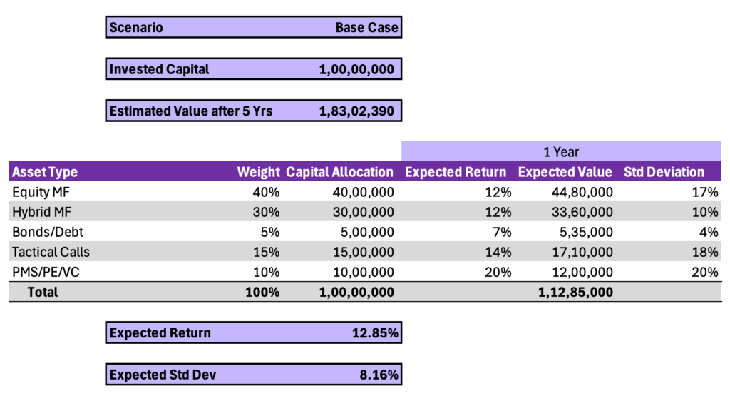 Asset allocation forms the foundation of every client portfolio. Through our in-house allocation framework, we consider multiple dimensions: risk-return trade-offs, correlations, fund manager styles, and time horizons. This process-driven approach ensures that portfolios remain balanced across cycles. By staying grounded in our method, rather than reacting to short-term performance, we follow the Stoic virtue of perspective – recognizing that long-term progress matters more than temporary fluctuations. Below is a sample of our asset allocation framework.